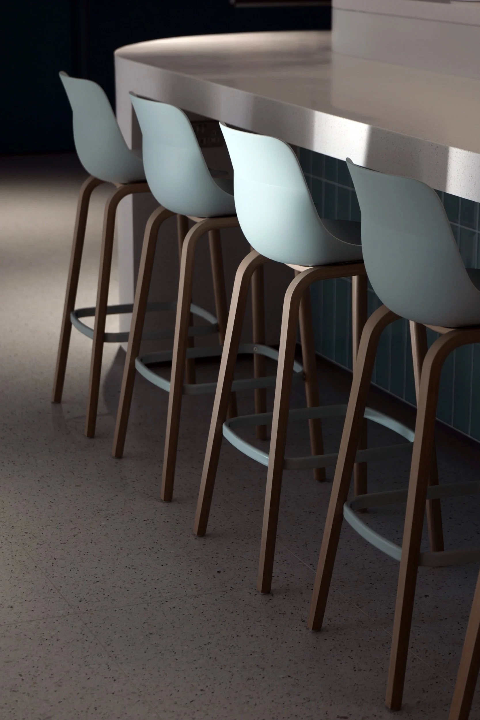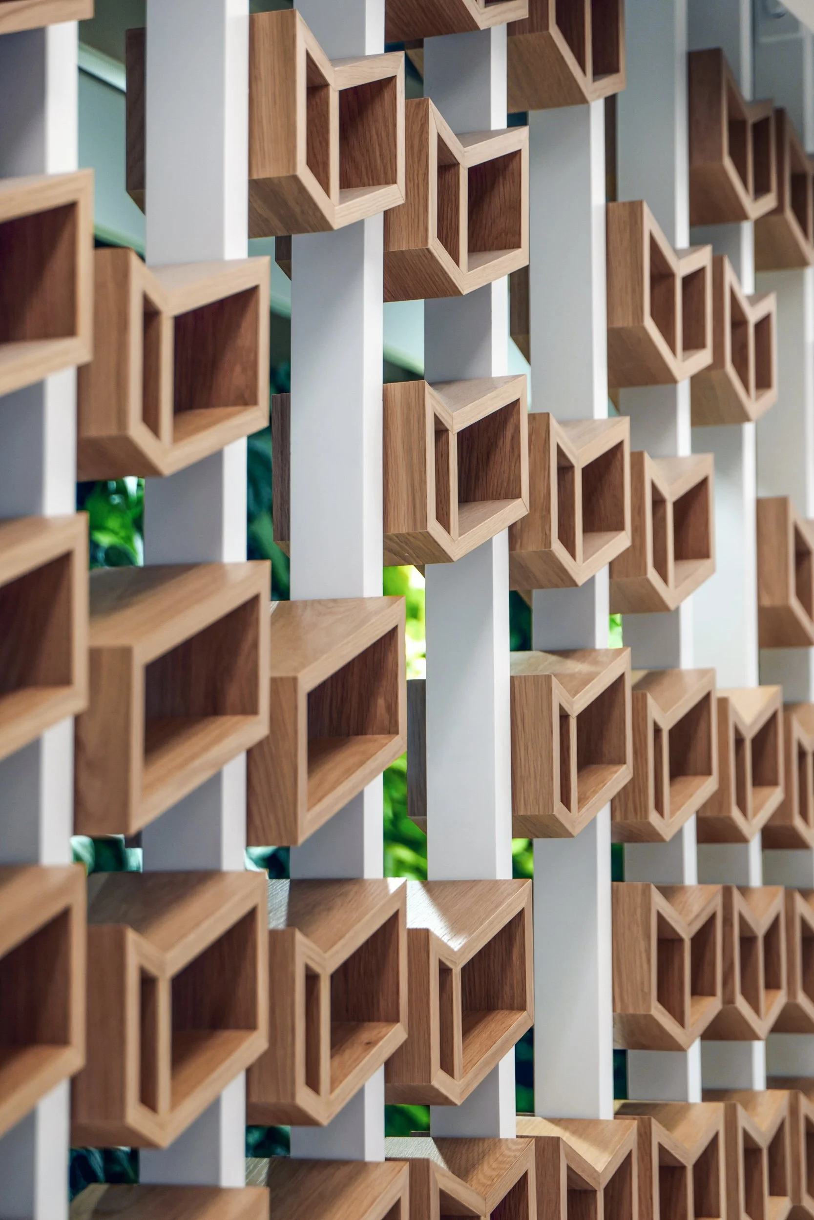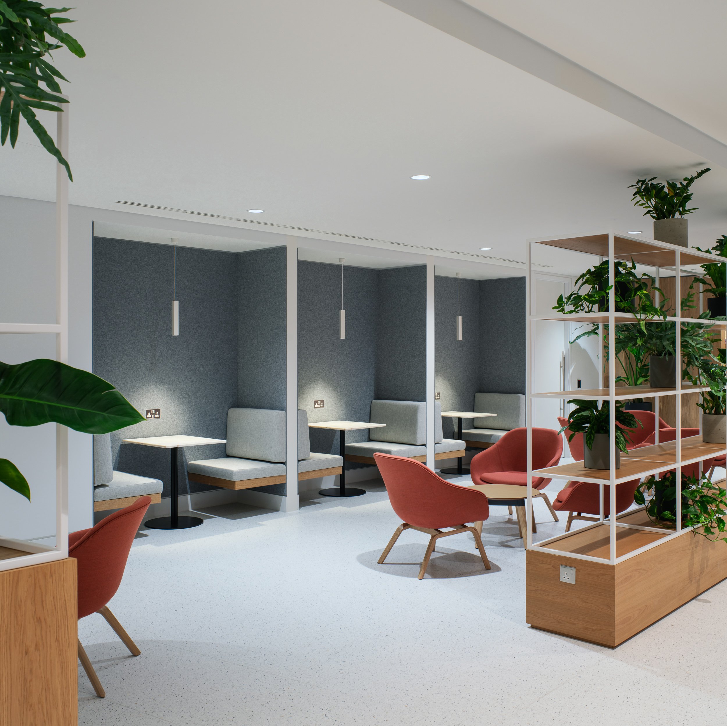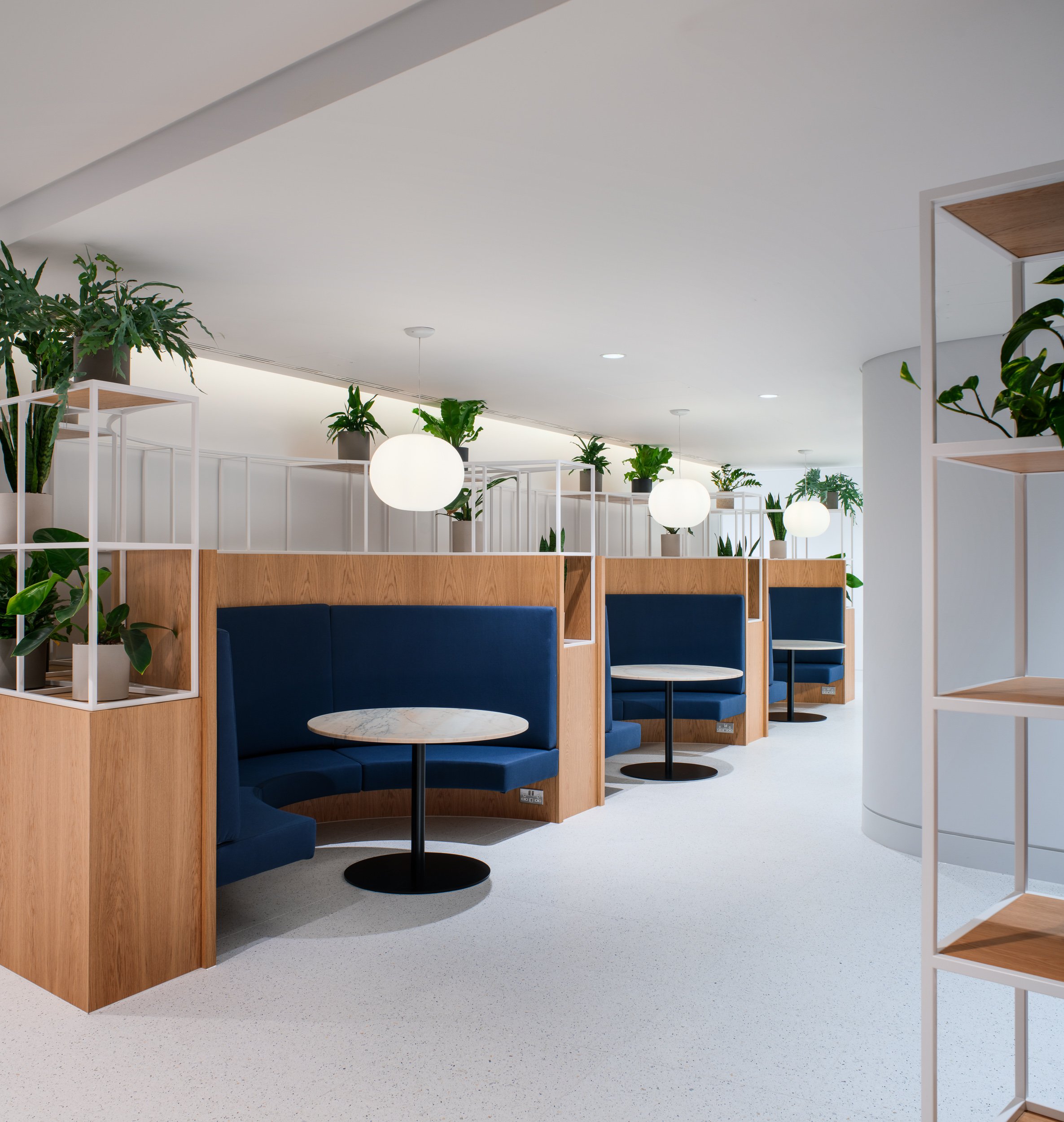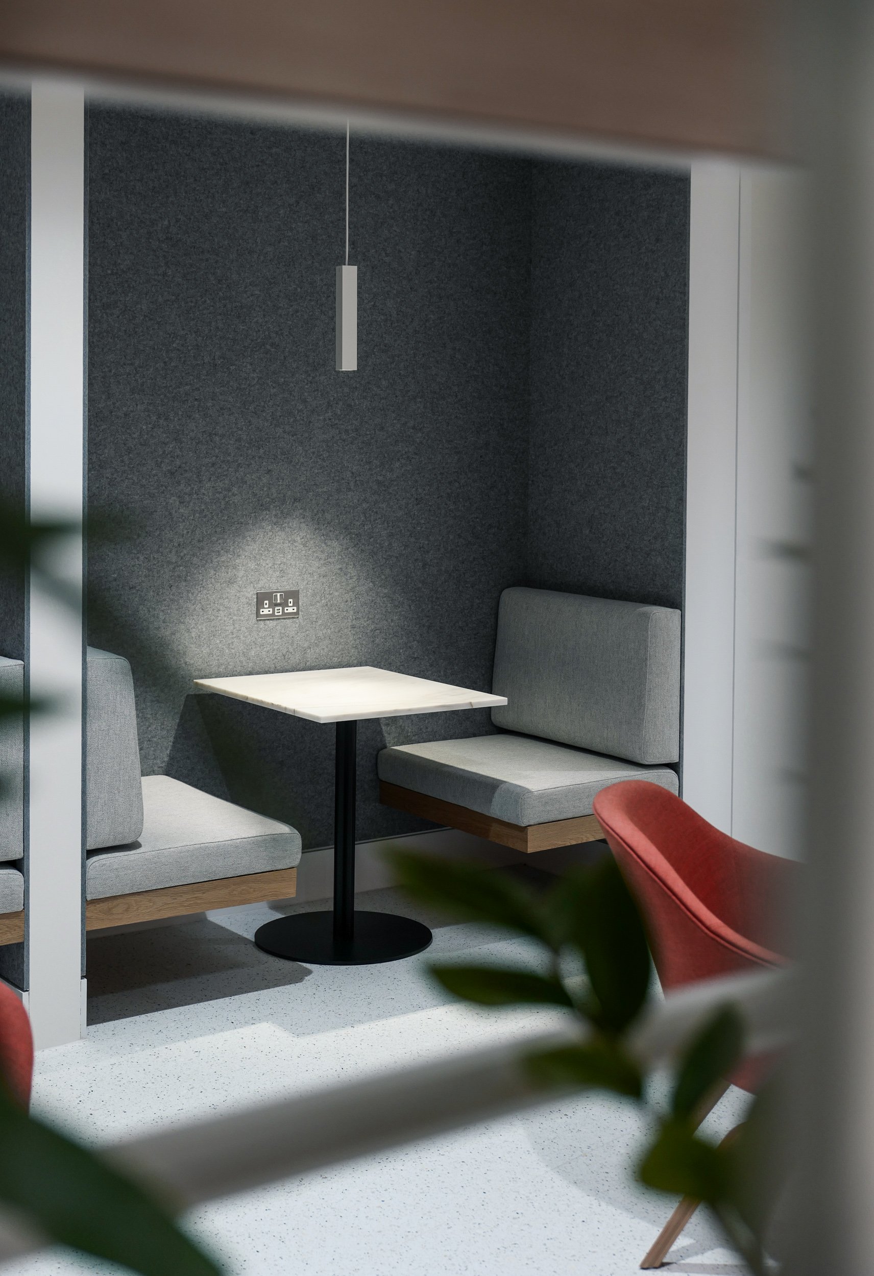 The new offices feature a standout reception area, defined by a striking interlinking staircase. Geometric timber boxes form part of the balustrade, creating a bold architectural screen that balances form and function. This sculptural centrepiece connects the two floors both physically and visually, setting the tone for the high-quality finishes found throughout the space.